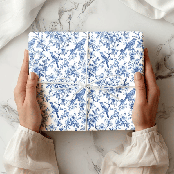 Blue Chinoiserie Wrapping Paper • Blue Floral Toile Design • Gift Wrap Roll for Baby Showers and Special Occasions • Elegant Blue and White Bird Pattern